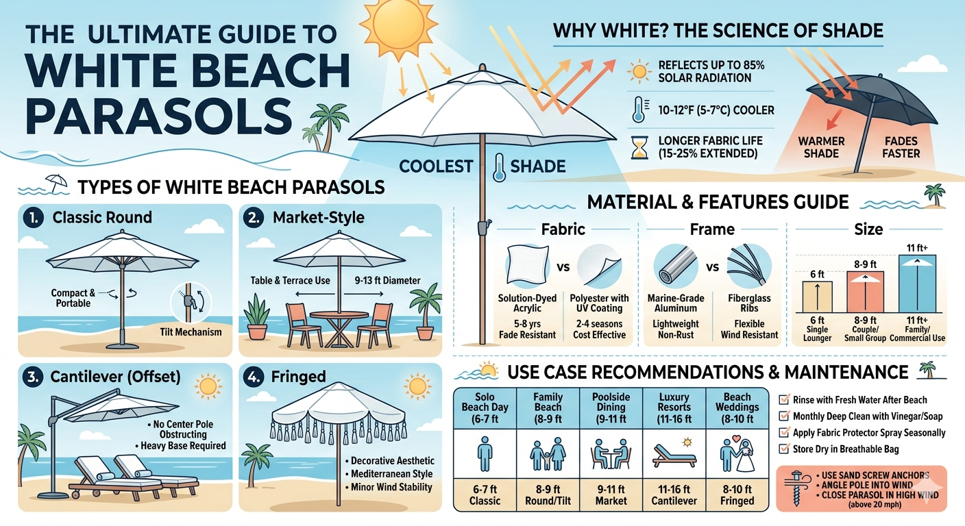Guide des tailles et des styles de parasols de plage blanche par cas d'utilisation
